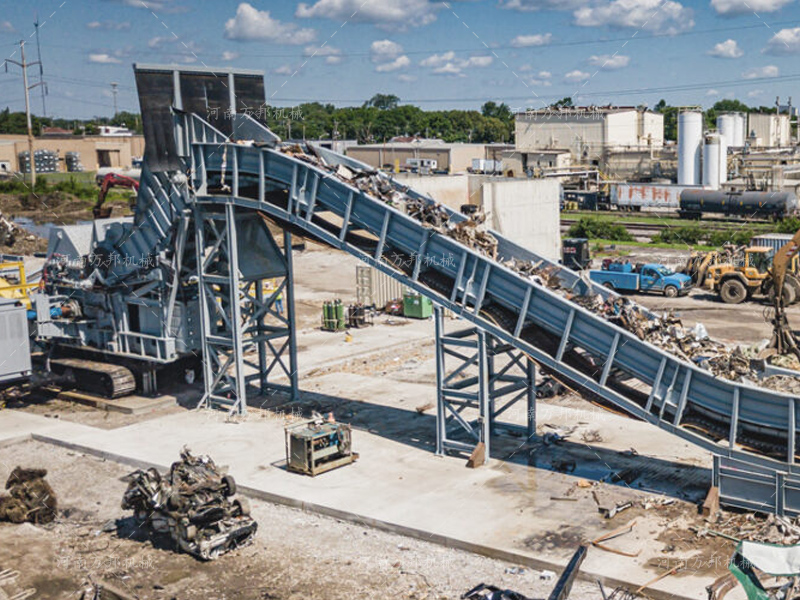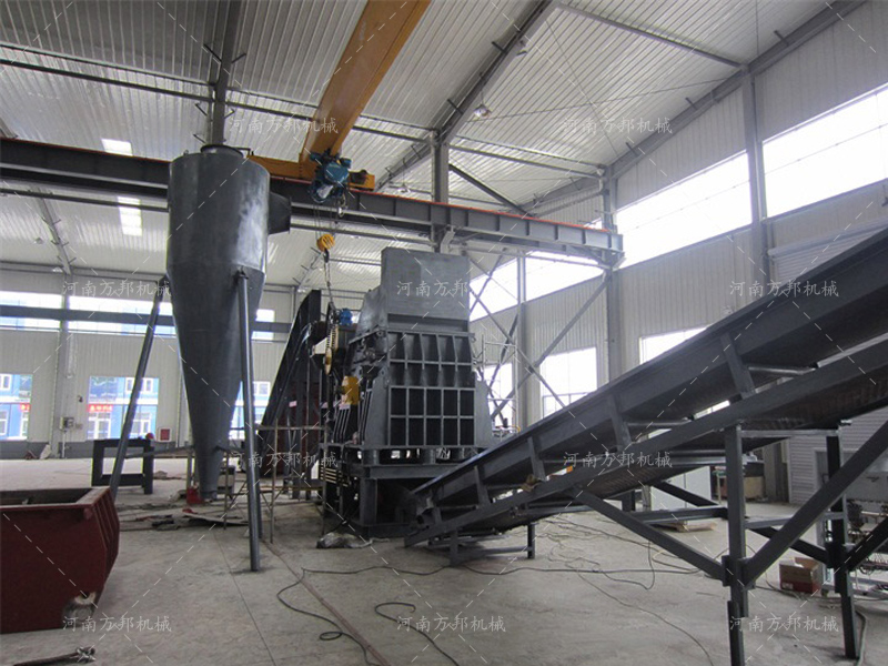在金屬揉球機(jī)原理上物料通過(guò)上料輸送裝置廢鋼破碎機(jī)送料滑板物料通過(guò)強(qiáng)制壓料輥和擠壓輥將廢鐵中易燃易爆物料進(jìn)行一次壓損防止物料產(chǎn)生爆炸,經(jīng)過(guò)一次壓損后的物料在二次壓料板的擠壓下被強(qiáng)制送入破碎機(jī)腔內(nèi),設(shè)備主軸在高速大扭矩電機(jī)的驅(qū)動(dòng)下,主機(jī)轉(zhuǎn)子上的錘頭輪流擊打進(jìn)入主機(jī)腔內(nèi)的金屬?gòu)U料進(jìn)行擊打、揉搓、撕裂加工將廢鐵中依附的雜質(zhì)、油漆、油污進(jìn)行清除最終將廢鋼一次性加工成球狀團(tuán)粒經(jīng)過(guò)設(shè)備底部篩網(wǎng)卸除完成破碎過(guò)程,經(jīng)過(guò)破碎后的物料經(jīng)設(shè)備底部震動(dòng)給料機(jī)均勻的送入出料皮帶輸送機(jī)經(jīng)過(guò)磁力分選后將廢鋼中的雜質(zhì)與鋼鐵進(jìn)行分離從而完成整個(gè)破碎作業(yè),該設(shè)備除了配備以上設(shè)施外還配備有隔音房、除塵系統(tǒng),在設(shè)備結(jié)構(gòu)上可見下圖: